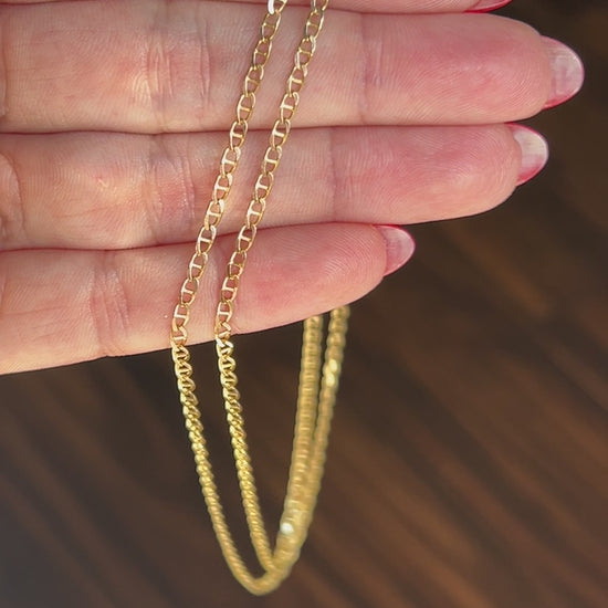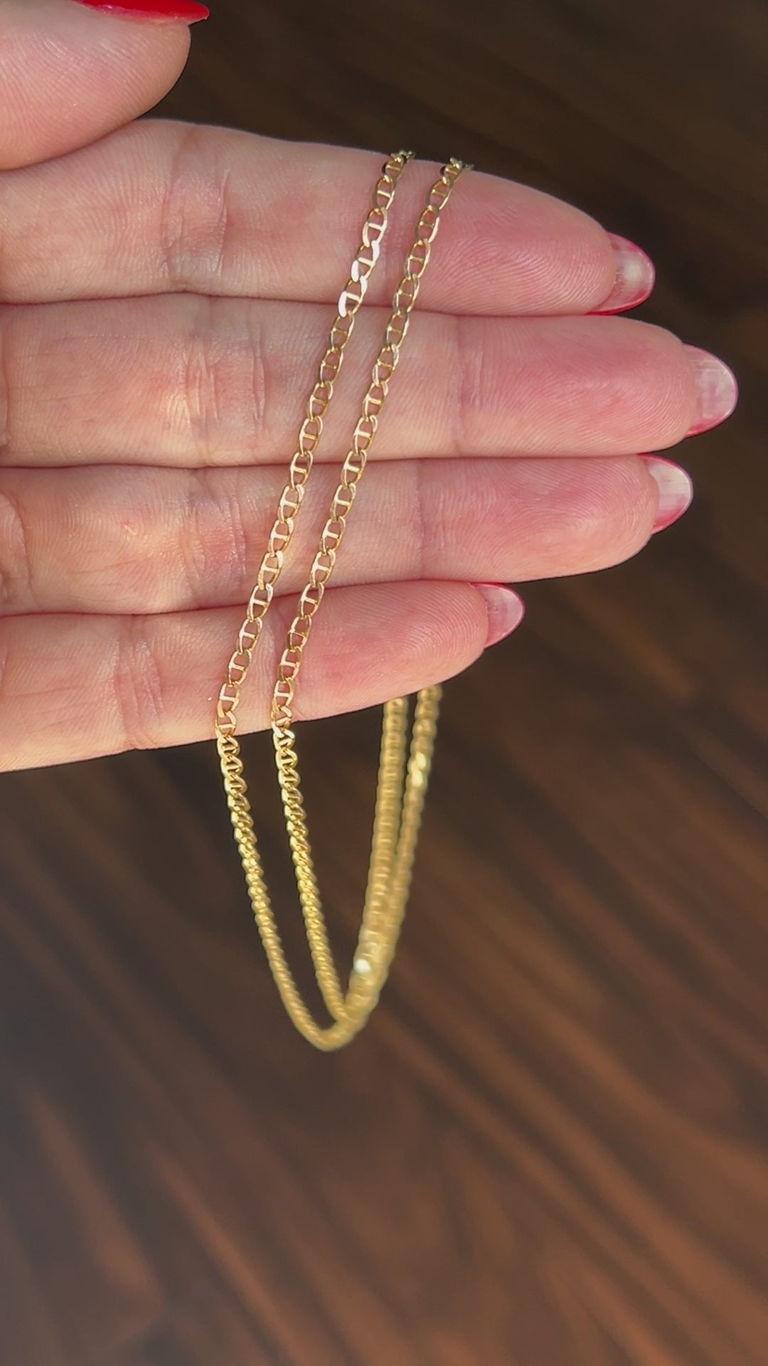 Beautiful Anchor/Mariner style chain in a nice longer 24” length. An excellent stack staple, featuring sturdy construction + solid links. This beauty is perfect for solo wear, layered looks, or showcasing your favorite pendants & charms!