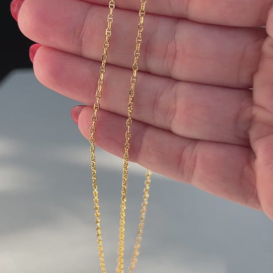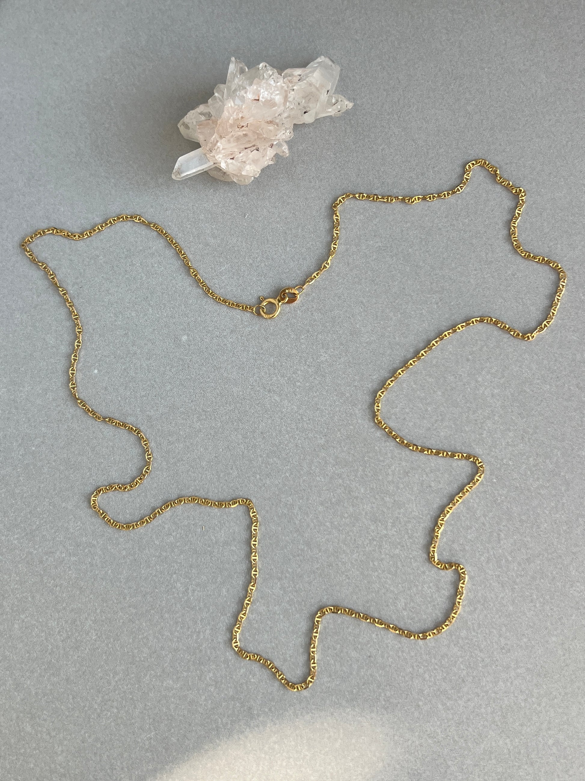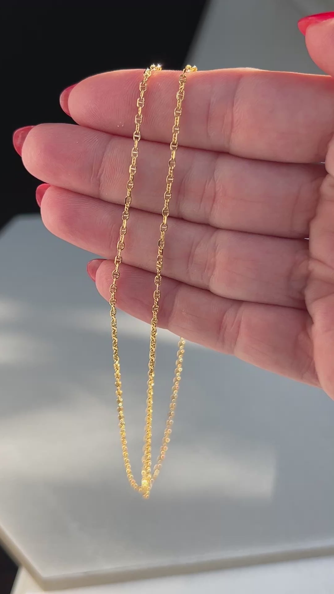 Lovely 24” long fancy anchor/mariner link chain. Beautiful sparkly little links and a wonderful rich saturated golden hue. Perfect for solo wear, layered looks, or showcasing your favorite pendants & charms.