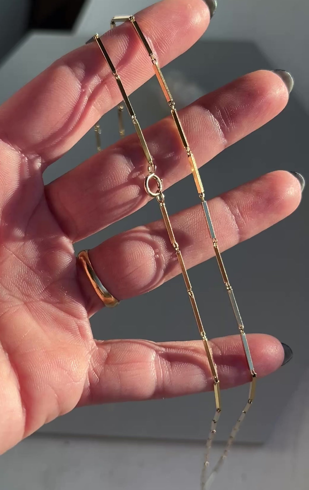 Fantastic bar link chain in a nice longer length. Fun, edgy, geometric texture, a great chain both for layering and solo wear.