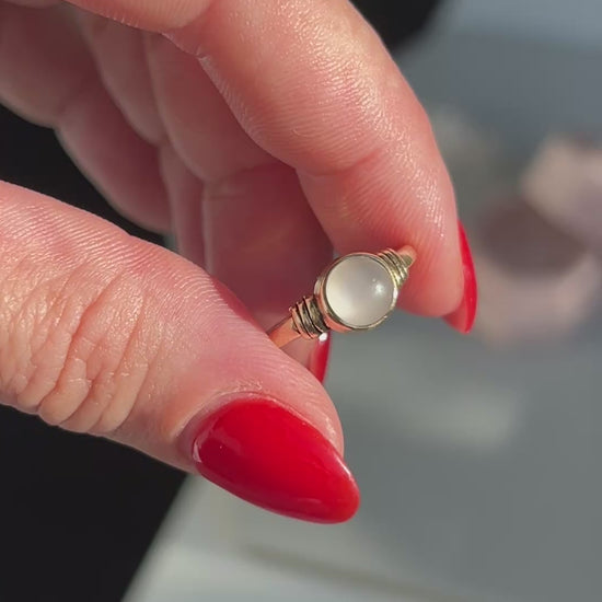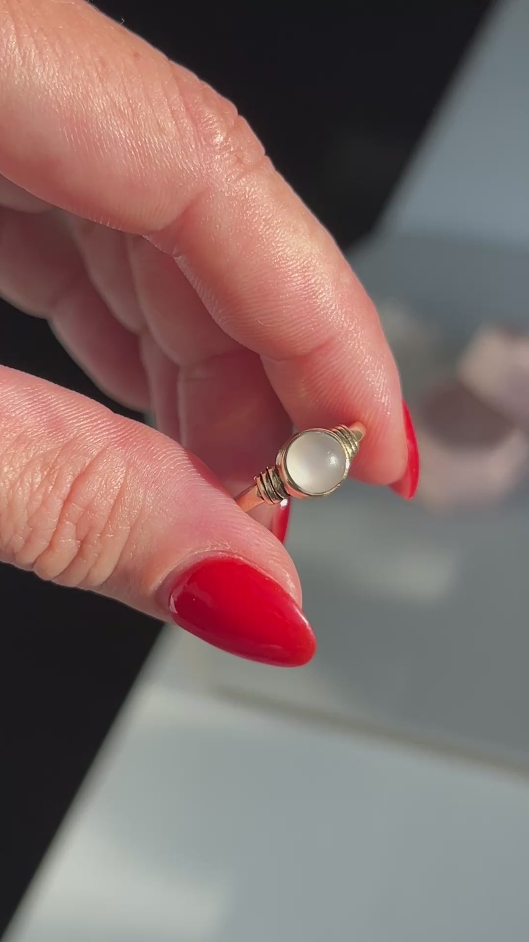 Fantastic little moonstone bauble for your finger! Glowy white ‘Cat’s Eye’ Moonstone displays fantastic asterism in the light.
