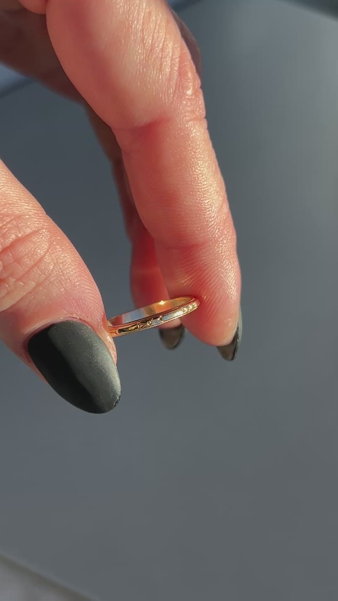 Incredible art deco era skinny gold band with a delicate floral inspired pattern.