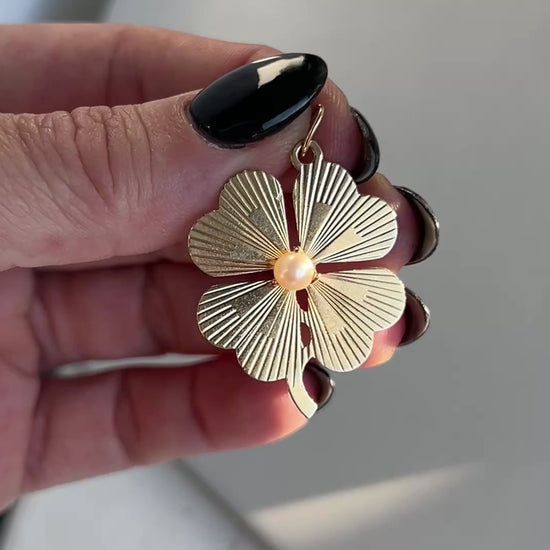 Vintage 14k Gold Engine Turned Lucky Shamrock Charm with Pearl