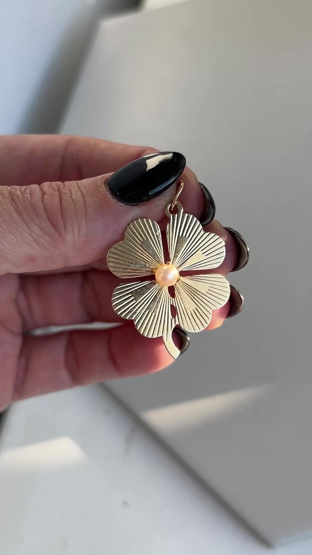 An ever popular style! A beautiful size and shape lucky shamrock pendant with a lustrous pearl accent and that Midcentury engine turned detailing that plays beautifully in any light. This coveted collectors piece is the perfect pendant for solo wear or as a base for all your charm stacks!