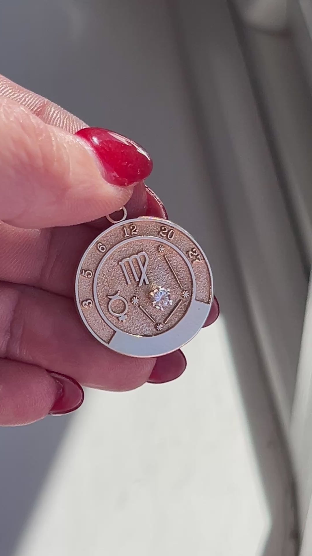 A fantastic, larger sized R&B zodiac charm featuring the star constellation and lucky numbers for Virgo, along with a blank space for engraving a name or date. This particular piece appears to have been customized with a sparkly, eye clean 10 pt diamond-